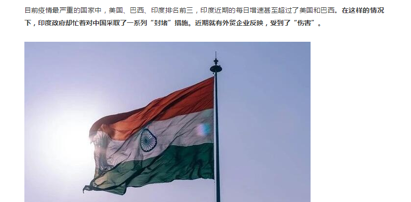 有公开信息显示,在过去的两周中,中国进口货物在包括印度孟买、钦奈在内的港口均受到阻碍,导致许多货箱在港口堆积。此外,由于印度海关近日严查中国货物,导致海关工作人员的工作量大增,对其他国家的进口货物通关也造成一定影响。