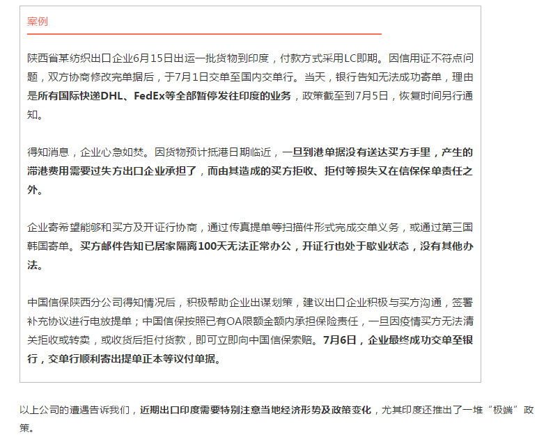1. 如果手中有印度订单。先和买方友好协商,确保能够顺利清关;与买方、船公司事先书面确认滞港等费用承担问题。尽量收取全额预付款或开具信用证方式;确保国际快递正常承接业务;咨询投保出口信用保险,获取风险保障。